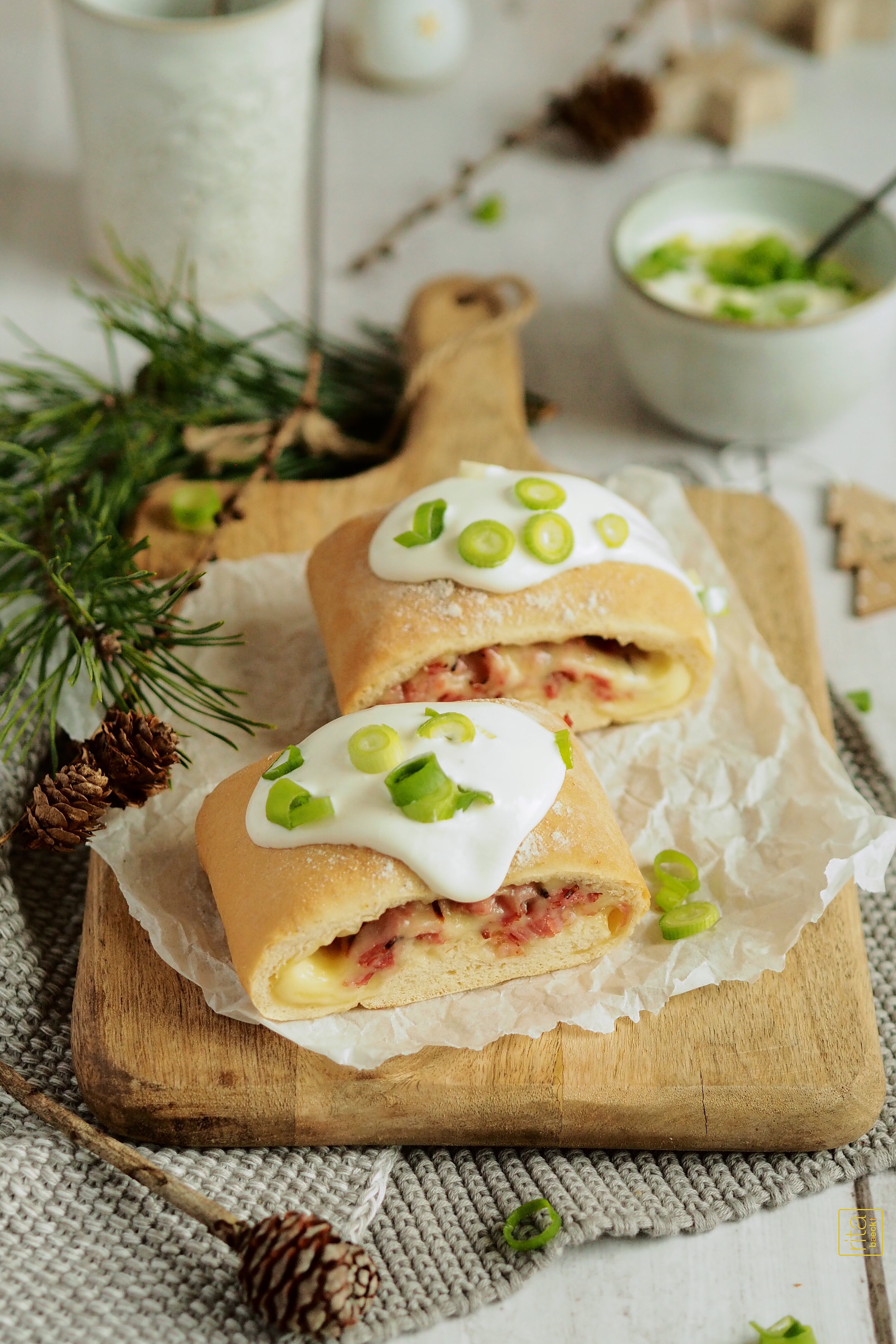 Danach auf eine leicht bemehlte Arbeitsfläche geben, kurz durchkneten und in zwei Teile teilen. Nochmals 5-10 min. entspannen lassen und anschließend ca. 30×15 cm gross ausrollen. Die Teiglinge in der Mitte mit Käse und Geselchtem oder Speck belegen und dabei einen Rand von ca. 2 cm frei lassen. Der Länge nach über die Füllung schlagen, die enden einschlagen und mit dem Schluss nach unten auf ein mit Backpapier ausgelegtes Backblech legen. Zugedeckt nun nochmals etwa 20 min. gehen lassen.